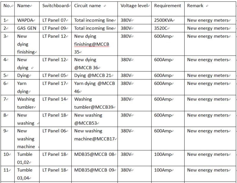 There are 12 monitoring instruments for the energy management system of the heavy industry in the factory, which are located in 12 high and low voltage panels. The water meter, fuel gas and oxygen will not be collected currently. The software has reserved the interface.