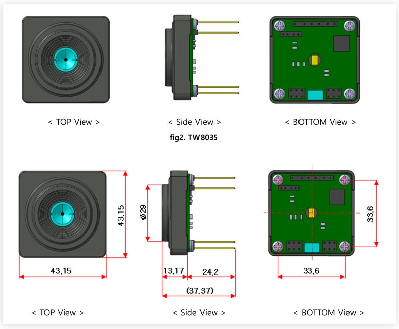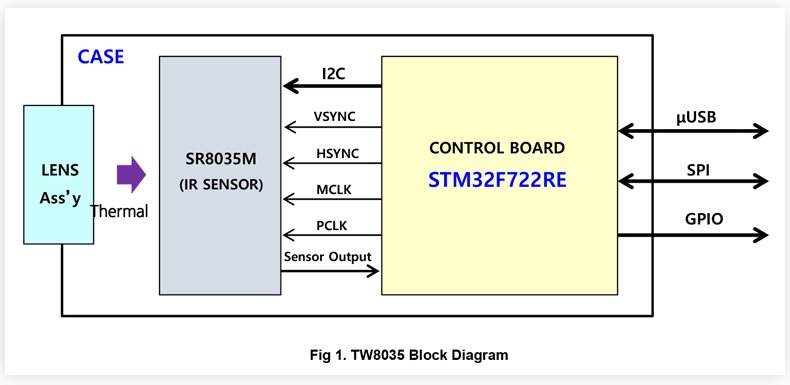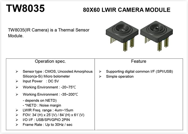TW8035composes of Sensor, Lens and thermal Data processing. TW8035 has SPI, USB.. The data includes Temp., Image data.